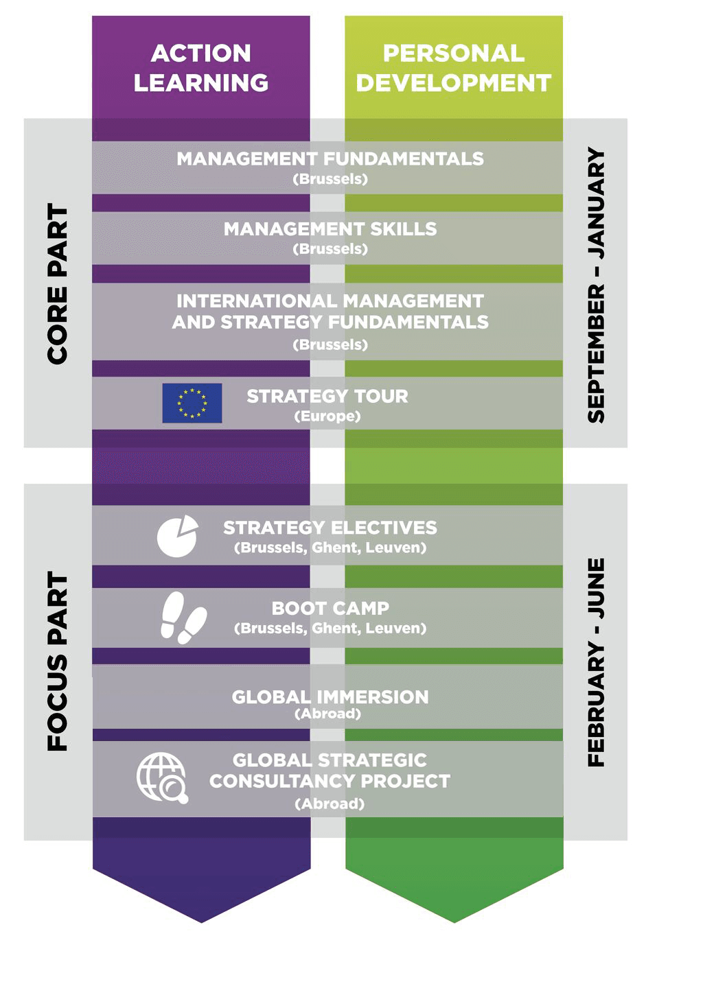 - Global company project: Over two months, you’ll apply everything you’ve learned in a real strategic consultancy project or global social project of your choice. You’ll work outside of Belgium with clients from a different country and culture, navigate the nature of working in (virtual) teams across borders and boundaries – and gain hands-on experience of managing a global business.